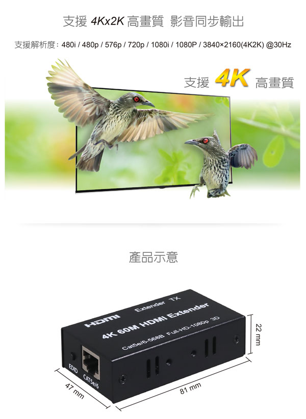 HDMI延伸器【60米】 4K2K 網路線 影音同步 HDR600U(不含網路線)