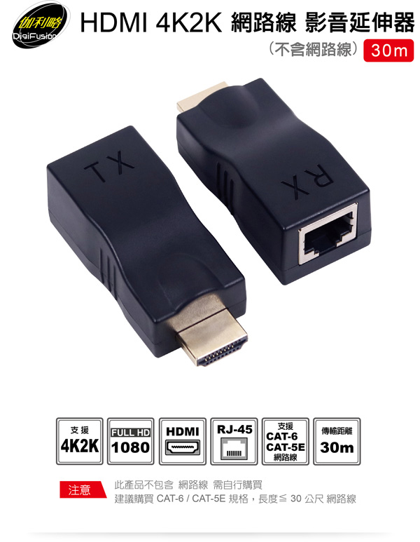 1080p最大可支援30公尺 / 4K2K最大可支援10公尺 - 支援 CAT-6 / CAT-5E 規格網路線:(需自行購買)