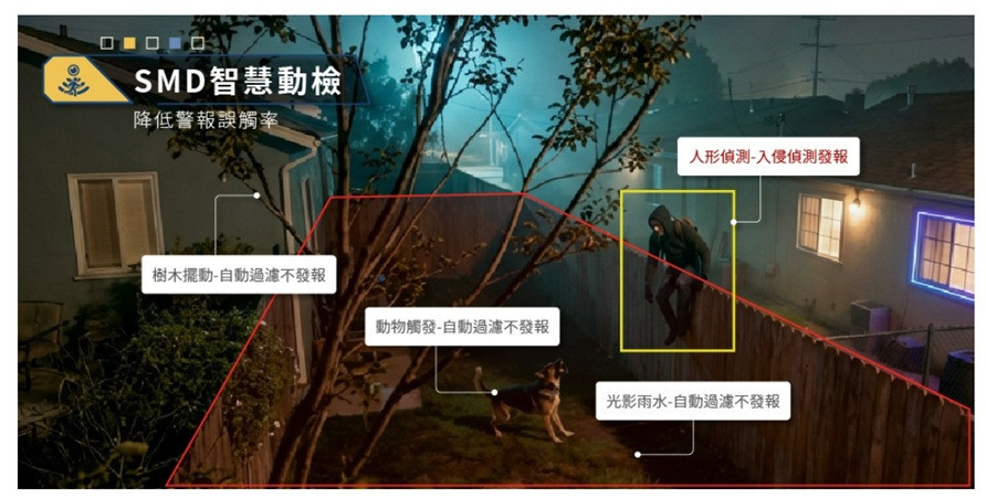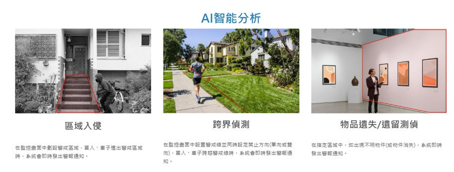 - AI 智慧事件(人/車分類) 支援 SMD 智慧動檢、跨界/區域入侵(人/車分類)、物品遺留/遺失、影像異常偵測。