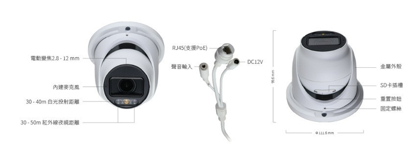 | 鏡頭 / 視角 | 電動變焦 2.8–12mm @F1.6;水平 108°–36° / 垂直 57°–20° / 對角 129°–42° |