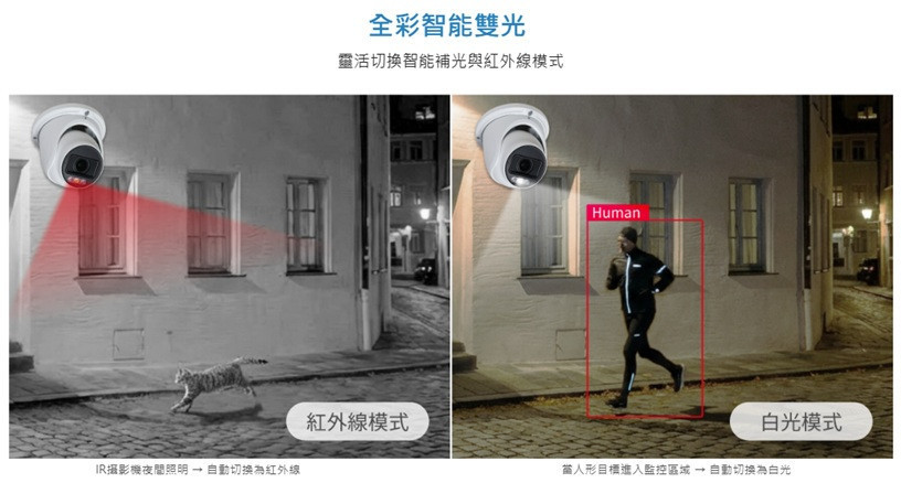 - 白光+紅外雙補光夜視(白光40m / 紅外50m) 白光投射距離 30–40m;紅外夜視距離 30–50m,支援智能補光與 ICR 日夜自動切換。