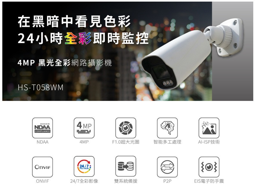 HiSharp HS-T058WM 4MP AI 網路攝影機|全彩夜視|EIS 電子防手震|人車辨識|PoE|IP67|鋐進電子