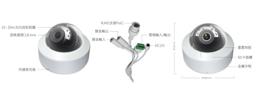 防水、防塵、防破壞,適合公共空間。 - PoE / DC12V 供電