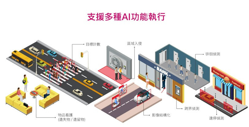 | AI 分析 | 人/車分類、入侵、跨界、徘徊、違停、物品遺失、人臉辨識 |