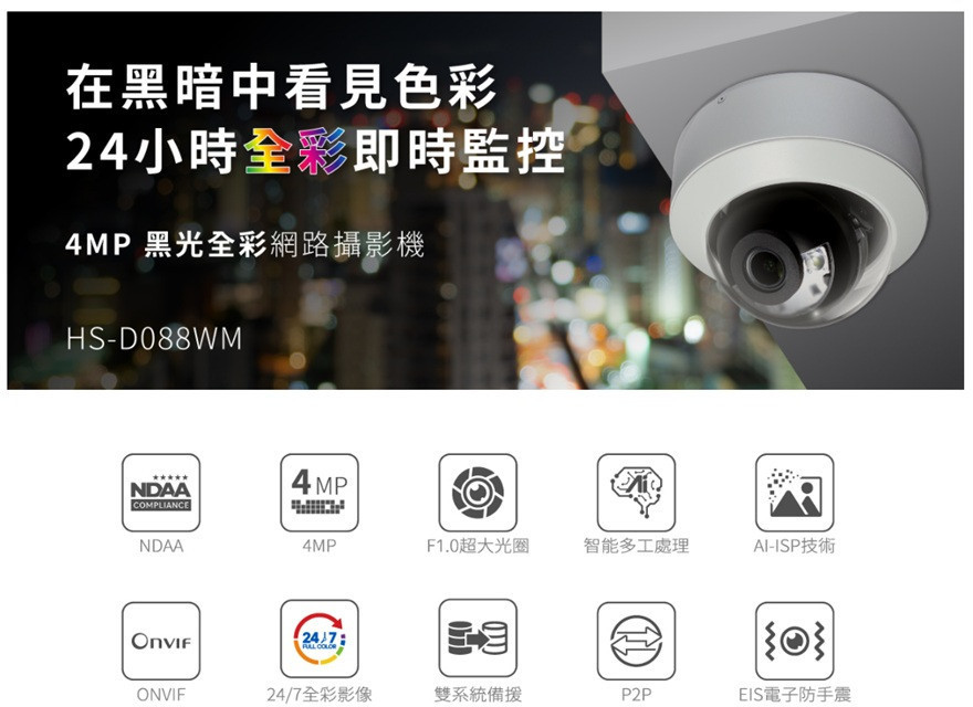 【HISHARP 昇銳 4MP 黑光全彩 AI 半球網路攝影機 HS-D088WM】