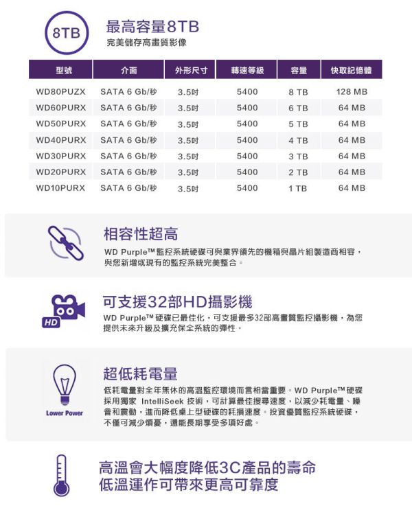 WD Purple 專為高溫環境下全天候監控系統的極端要求設計。